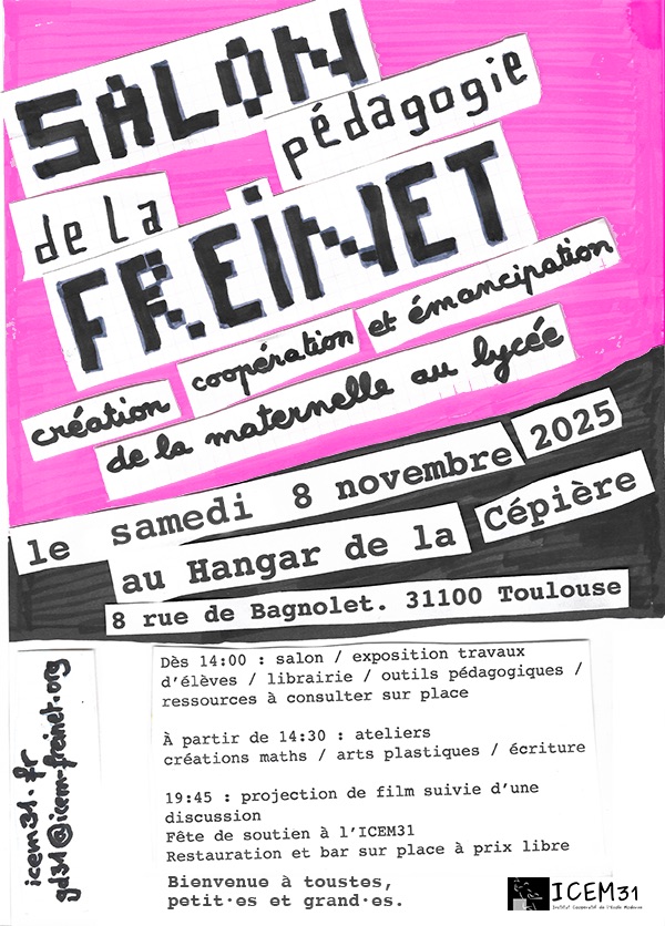 Venez découvrir la pédagogie Freinet, nos ressources nos créations, nos activités, des idées pour vos classes… le samedi 8 novembre 2025 au Hangar de la Cépière (Toulouse).
